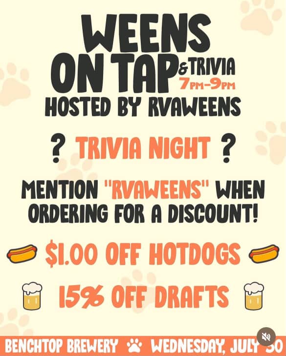 Where: Benchtop Brewing RVA (434 Hull Street, Richmond, VA) Bring your adorable Doxies indoors for a night packed with brain-bending trivia, gourmet hot dogs, and ice-cold brews. Infinity questions, incredible discounts, and endless tail wags await!